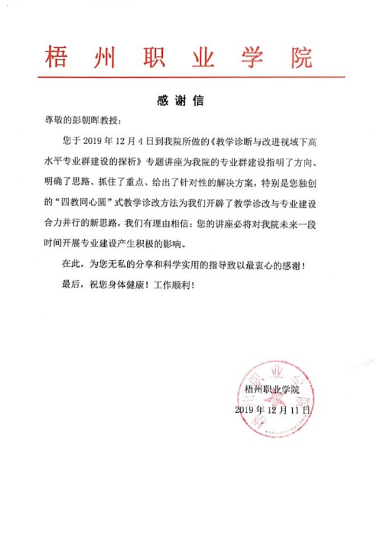 受梧州职业学院邀请做题为《教学诊断与改进视域下高水平专业群建设的探析》的专题讲座感谢信