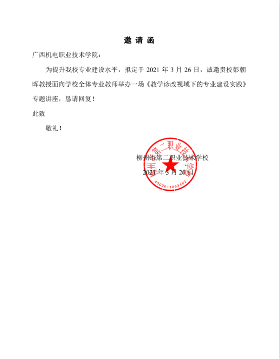 受柳州市第二职业技术学校邀请做题为《教学诊改视域下的专业建设实践》的专题讲座邀请函