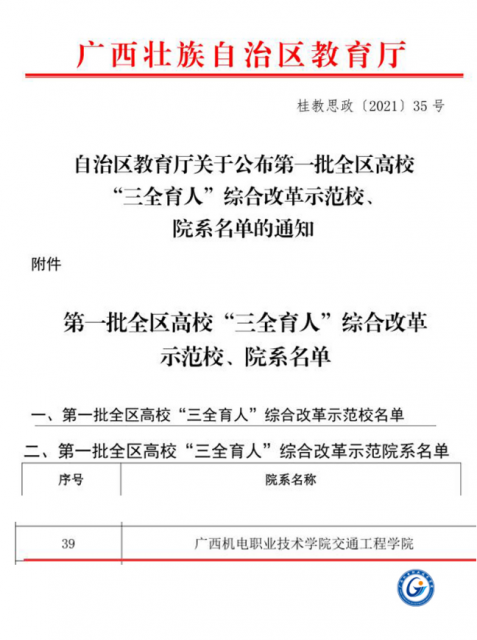近日,广西壮族自治区教育厅公布了第一批全区高校“三全育人”综合改革示范校、示范院系评选结果,我院成功入选全区高校“三全育人”综合改革示范院系。 推进“三全育人”综合改革,是学习...
