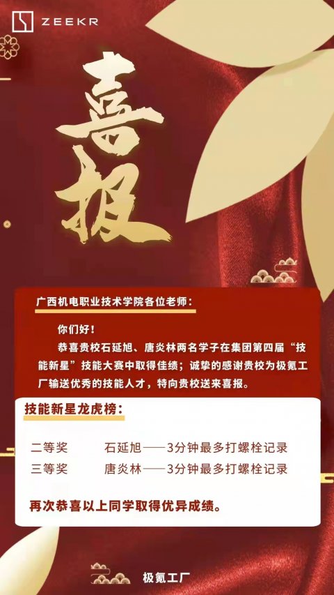 12月22日,吉利汽车集团领克梅山工厂传来喜报,我院2020级B批次跟岗实习学生在汽车吉利第三届“技能新星”大赛中荣获佳绩,其中荣获一等奖1名同学,荣获二等奖6名同学,荣获三等级4名同学,...