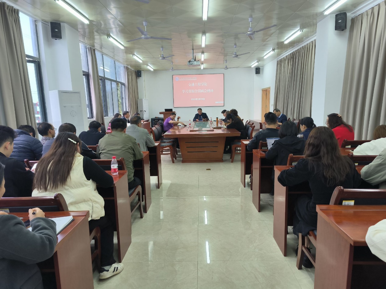 3月19日下午,我院召开学习贯彻两会精神会议,会议由书记、院长彭朝晖主持,交通工程学院全体教职员工参加。 彭书记说道,十四届全国人大二次会议于2024年3月5日在北京召开,全国政协十四届...