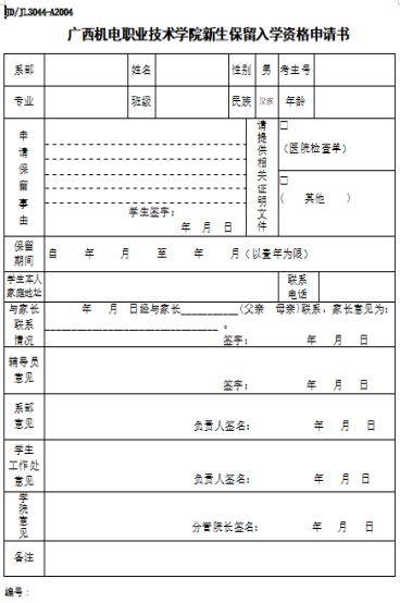 新生保留入学资格申请书(个人原因用表)