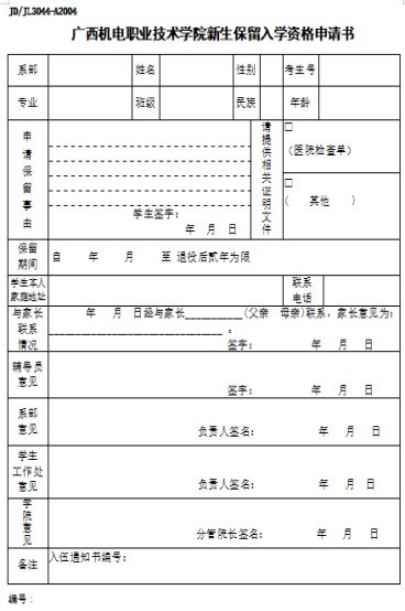 新生保留入学资格申请书(入伍原因用表)
