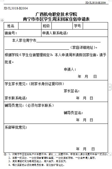 学生周末回家住宿申请表