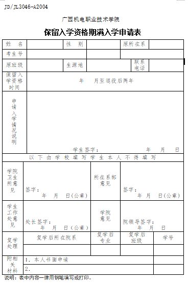 新生保留入学资格期满入学申请表