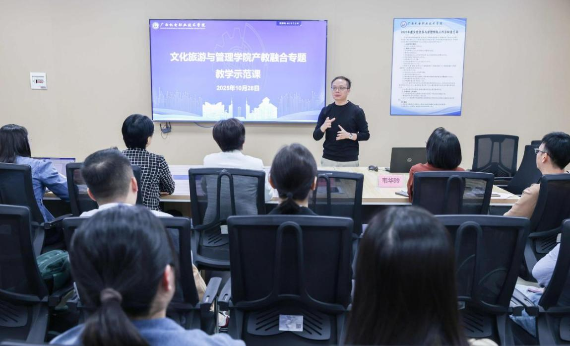 产教融合是推动职业教育高质量发展的关键路径。中共中央办公厅、国务院办公厅印发的《关于深化现代职业教育体系建设改革的意见》明确提出,需坚持“以教促产、以产助教、产教融合。”为提高教师的实践教学能力和产教融合育人水平,响应学校教学质量文化主题活动的号召,10月28日,文化与旅游管理学院组织开展产教融合示范课说课比赛。学院党委书记黄妩、院长付瑶、学院各专业带头人、教研室主任及多位评委老师和青年教师代表共同参与观摩学习。