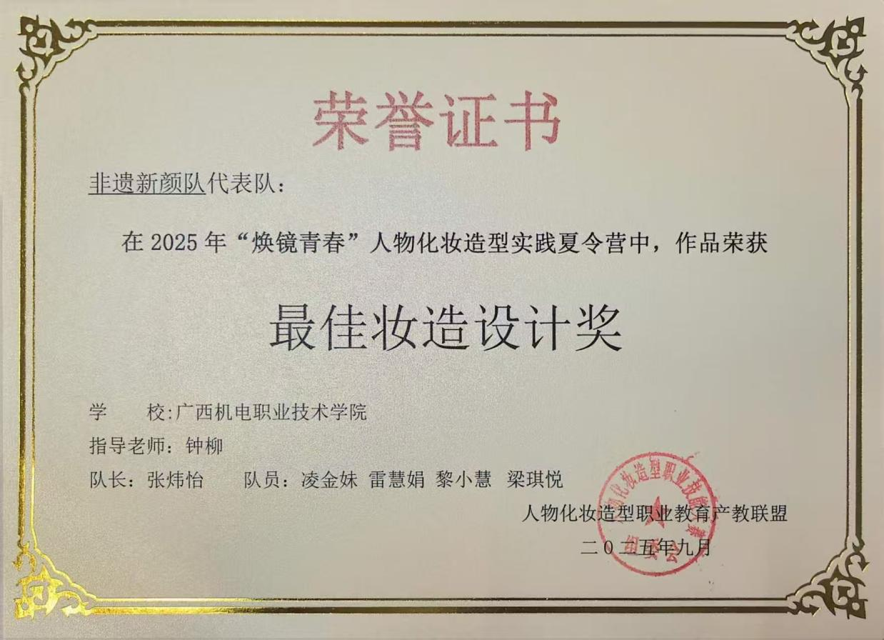 此次参赛的“非遗新颜队”由学员张炜怡、凌金妹、雷慧娟、黎小慧、梁琪悦组成。团队以“国风新貌”为主题,深入挖掘广西12个世居民族的文化内涵,将壮族刺绣纹样、瑶族银饰元素等传统美学符号融入现代妆造设计与短视频创作中。作品《壮美壮妹》以“非遗新颜”为核心理念,通过15至30秒的变装短视频,生动演绎了“美人之美,美美与共”的美育精神,展现了精湛的妆造功底与民族文化的创新表达,最终在创意、妆造与技术运用等维度中获评“最佳妆造设计奖”。