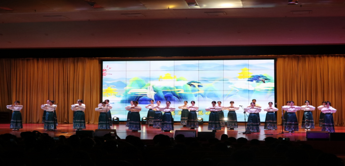 晚会在一曲典雅悠扬的诗经诵读《小雅·鹿鸣》中拉开帷幕,100多名同学身着汉服,集体诵读诗经,古韵袅袅,展现了诗歌的韵律美和意境。学院舞蹈团的同学们表演的群舞《万疆》以优美的舞姿抒发了对祖国山河的深情礼赞,民族服装走秀节目通过多民族服饰的精彩展示,呈现了中华民族服饰文化的多元魅力。