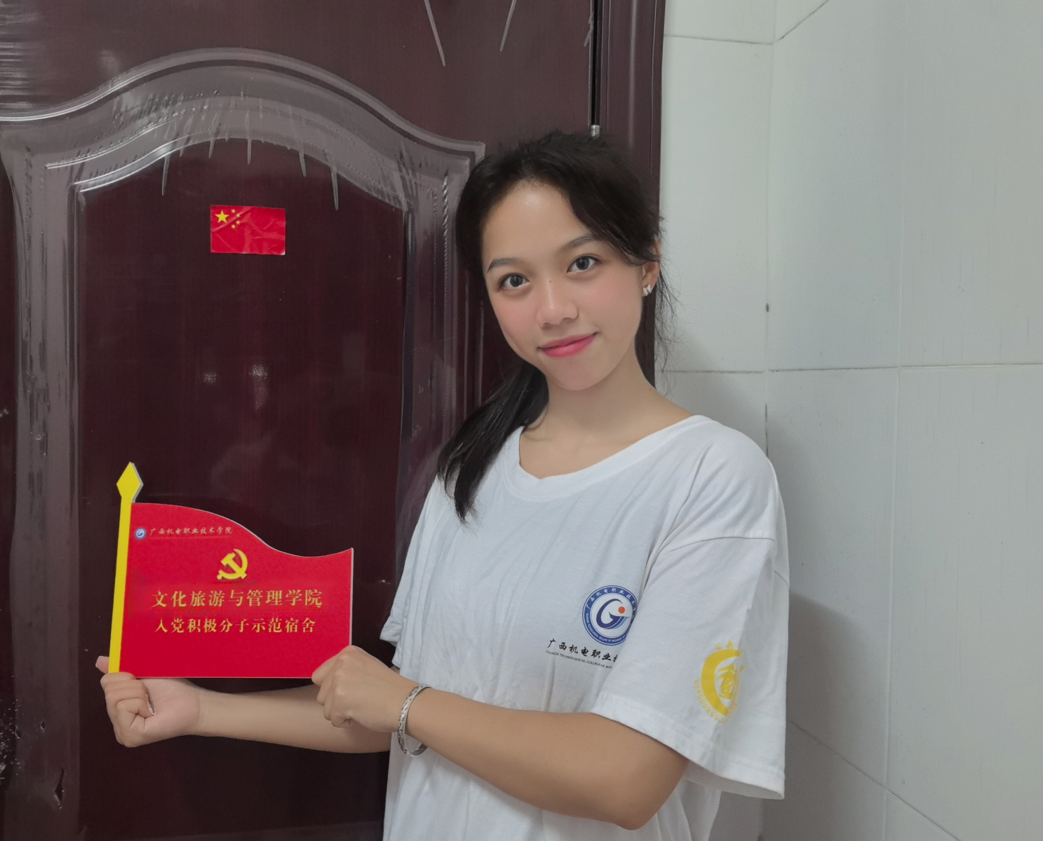 授牌仪式上,学生党支部书记陈丽婷强调,学生示范宿舍创建是深入开展“党建带团建”、拓展党建育人阵地、推动学院“三全育人”工作走深、走实的前沿阵地。希望获得授牌的入党积极分子、团支书和优秀学生干部切实增强责任感和使命感,自觉做到亮身份、当先锋、树形象、作表率。同时,她号召广大同学积极参与学院学生宿舍区文化长廊建设中,将宿舍区打造成为引领青年学生健康成长的重要阵地。