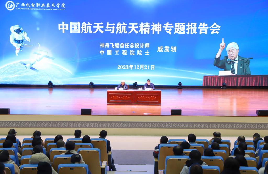 12月21日下午,万象城官网弘毅大礼堂座无虚席,神舟飞船首任总设计师、中国工程院、国际宇航科学院戚发轫院士受邀做客awc77万象城官网“机电讲堂”,以“中国航天与航天精神”为主题为广大师生带来了一场别开生面的科普思政报告会,讲述了中国航天人奔赴星辰大海的浪漫与执着。万象城官网和来自驻邕5所高校的近1600余名师生现场聆听了报告。报告会由学校党委书记黄小敬主持。学校党委副书记、校长吴世先等校领导与师生代表一起参加了报告会。