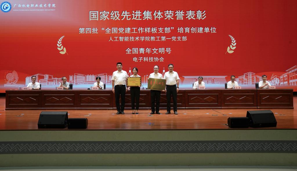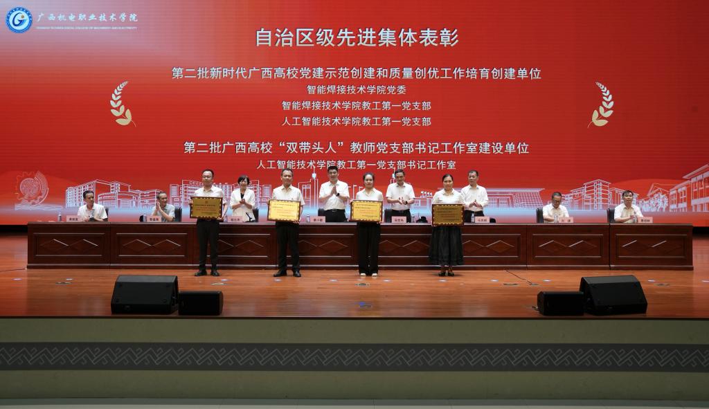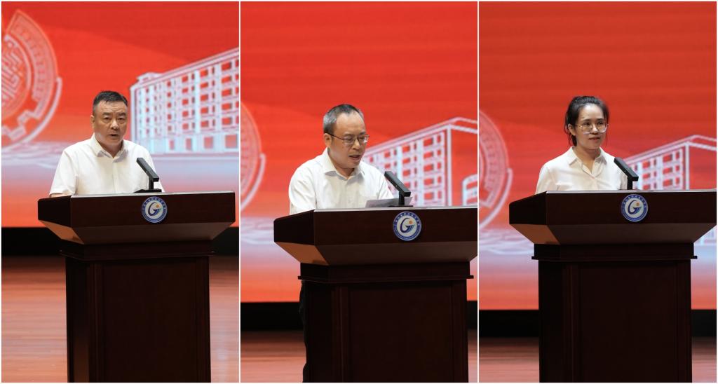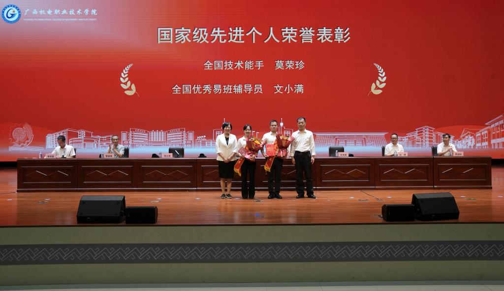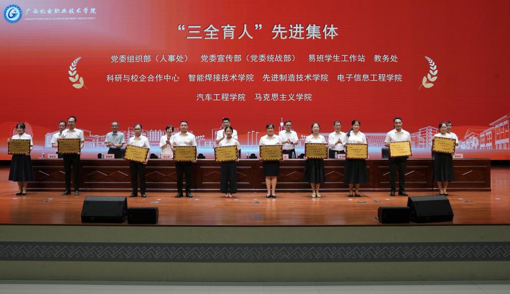 会上,吴世先宣读了获国家级和自治区级先进集体、先进个人的系列表彰决定,一批在党建思政、教学科研、职业技能竞赛、教学竞赛、创新创业竞赛、体育竞赛、社会服务等方面表现优异的集体和个人受到上级表彰。程云燕宣读了《关于表彰2024年度学校“三全育人”先进集体、先进个人和机电最美教师的决定》,全校共有10 个部门(单位)获得“2024 年度学校‘三全育人’先进集体”荣誉称号、7名同志获得“2024 年度学校‘三全育人’机电最美教师”荣誉称号、86名同志获得“2024 年度学校‘三全育人’先进个人”荣誉称号。