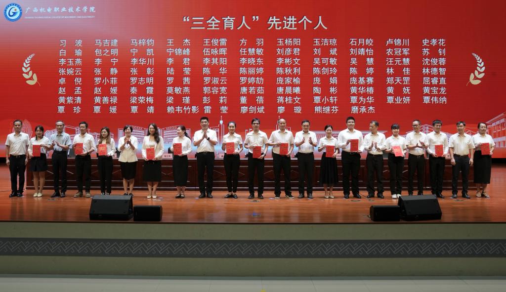黄小敬强调,今年是习近平总书记提出“四有”好老师10周年,也是习近平总书记致信教师代表提出中国“教育家精神”1周年。今年教师节的主题是“大力弘扬教育家精神,加快建设教育强国”。我们要深刻认识教育家精神是广大教师在长期教育实践中形成的宝贵精神财富,是矢志奋斗的共同价值追求和躬耕教坛的强大精神动力,大力弘扬教育家精神,争做新时代高素质“良匠之师”。他希望全校教师要践行教育家精神,争做胸怀“国之大者”的良匠之师,争做矢志躬耕教坛的良匠之师,争做甘为学生人生出彩的良匠之师,在主动服务融入广西“一区两地一园一通道”建设和有力支撑广西新一轮工业振兴的办学实践中,加快建设广西领先、国内一流、国际知名的高水平智能制造特色校,推动学校新一轮“双高”建设再上新台阶,为实现中国式现代化广西篇章做出广西机电新的更大贡献!以优异的成绩向新中国成立75周年献礼!