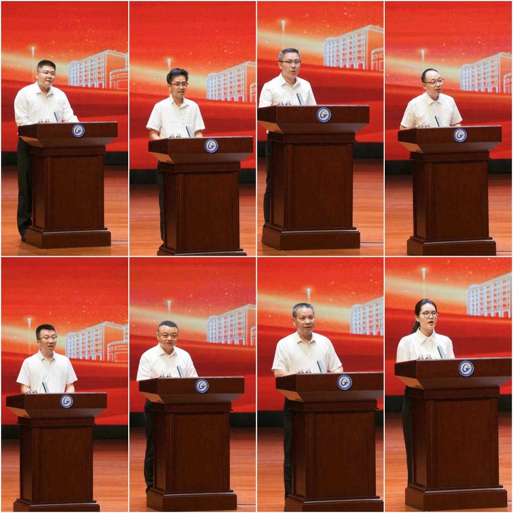 学校2025年“三全育人”先进个人代表陶彬、机电最美教师代表吕金亚、广西工匠代表熊治文、博士代表杜英俊;先进集体代表、人工智能技术学院院长张泽民;2024年集体荐才奖代表、绿色建筑与低碳技术学院党委书记罗满,通识教育学院党委书记、院长黄金来;新入职教师代表蓝婷分别作了交流发言。
