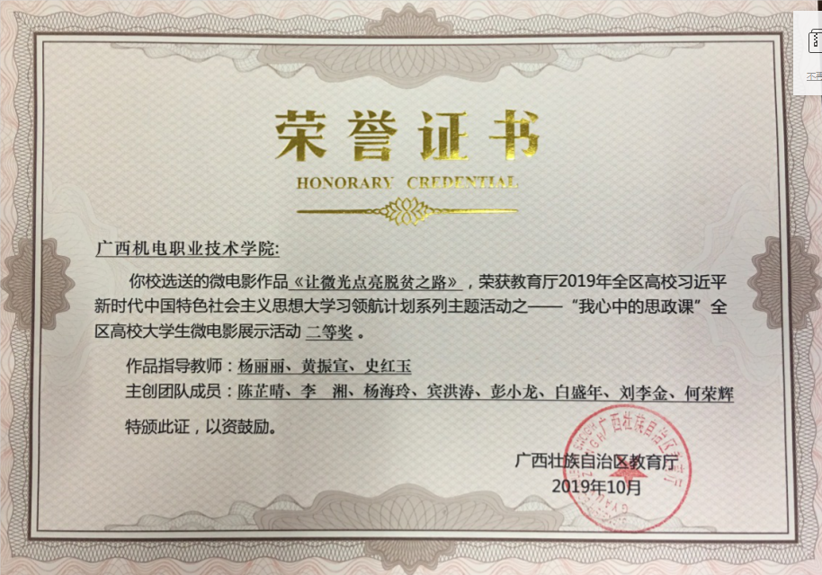 11月3日,自治区教育厅公布了2019年广西高校大学生践行社会主义核心价值观微电影大赛获奖名单,我部选送《让微光点亮脱贫之路》(学生团队:陈芷晴、杨海玲、李湘等8人;指导教师:杨丽丽、黄振宣、农冠军)荣获二等奖。该作品展现了我院师生积极参与脱贫攻坚活动,了解贫困户致贫原因后积极帮扶贫困户寻找渠道销售壮锦的脱贫故事。