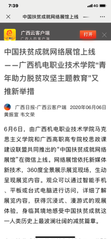 “中国扶贫网络展馆”一经推出,即获得广泛关注和好评,《广西云》以《中国扶贫成就网络展馆上线——awc77万象城官网“青年助力脱贫攻坚主题教育”又推新举措》对其进行宣传和报道。