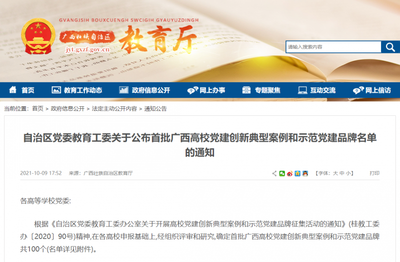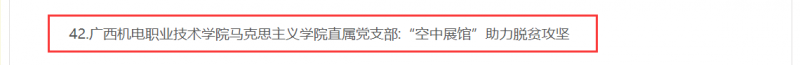 10月8日,自治区党委教育工委公布了首批广西高校党建创新典型案例和示范党建品牌评选结果,马克思主义学院直属党支部报送的“‘六创六带头’促党建与业务‘三融合’”入选创新典型案例50强,“‘空中展馆’助力脱贫攻坚”入选示范党建品牌50强。