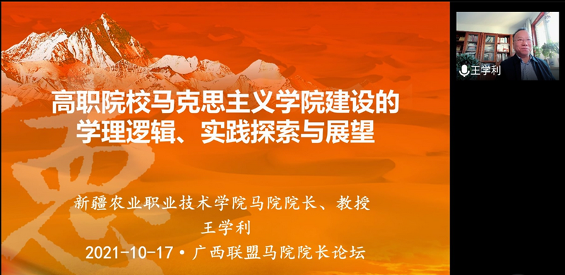 本次研讨会采用线上与线下相结合的方式开展,全国高校思想政治理论课2014年影响力人物、全国最美思政课教师,同时也是本次在“云端”参会的新疆农业职业技术学院马克思主义学院院长王学利教授为此“点赞”:“实践证明云端没什么不好!节约时间,节约成本,线上线下互动,一届马院院长论坛被广西联盟克服疫情困扰,办得精彩纷呈。”