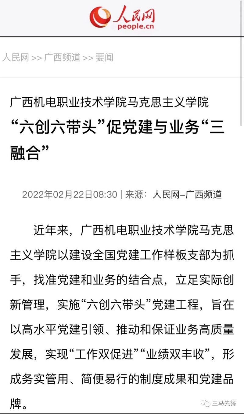 2022年2月22日,马克思主义学院教师林子琳、李一玉在人民网上刊发题为《“六创六带头”促党建与业务“三融合”》的文章,讲好全国党建工作样板支部的“机马故事”。以下为文章全文。