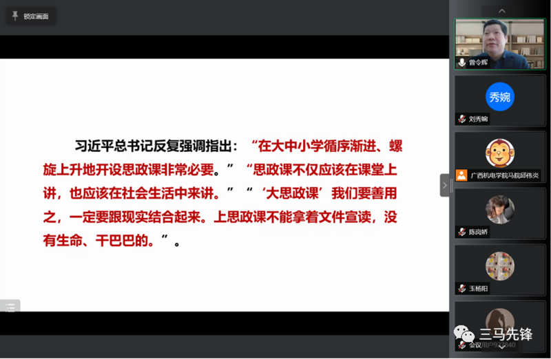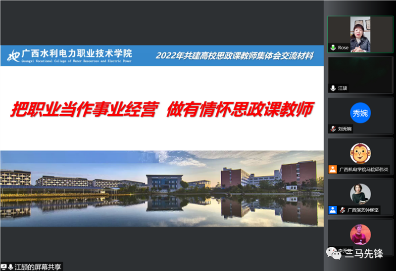 会议邀请了南宁师范大学马克思主义学院院长曾令辉教授、新疆农业职业技术学院马克思主义学院院长王学利教授、广西水利电力职院技术学院思政部主任江颉教授作了专题报告;邀请2021年度广西职业教学能力大赛一等奖获奖团队、广西水利电力职业技术学院的郭曼、谭海棠、张丛磊等3位教师进行示范课教学展示。
