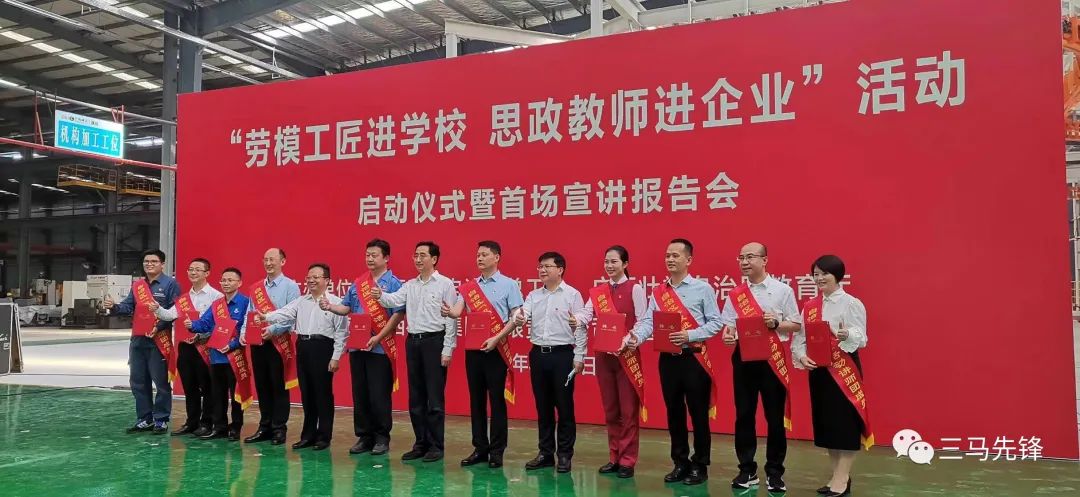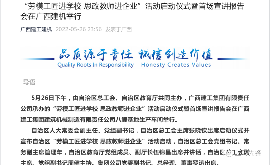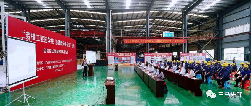 2022年5月26日下午,自治区“劳模工匠进学校 思政课教师进企业”活动启动仪式暨首场宣讲报告会在广西建工集团建筑机械制造有限责任公司生产车间举行。马克思主义学院院长黄振宣教授作为高校思政课教师代表,受邀出席启动仪式并领受聘书。自治区人大常委会主任、总工会主席张晓钦等领导出席启动仪式。