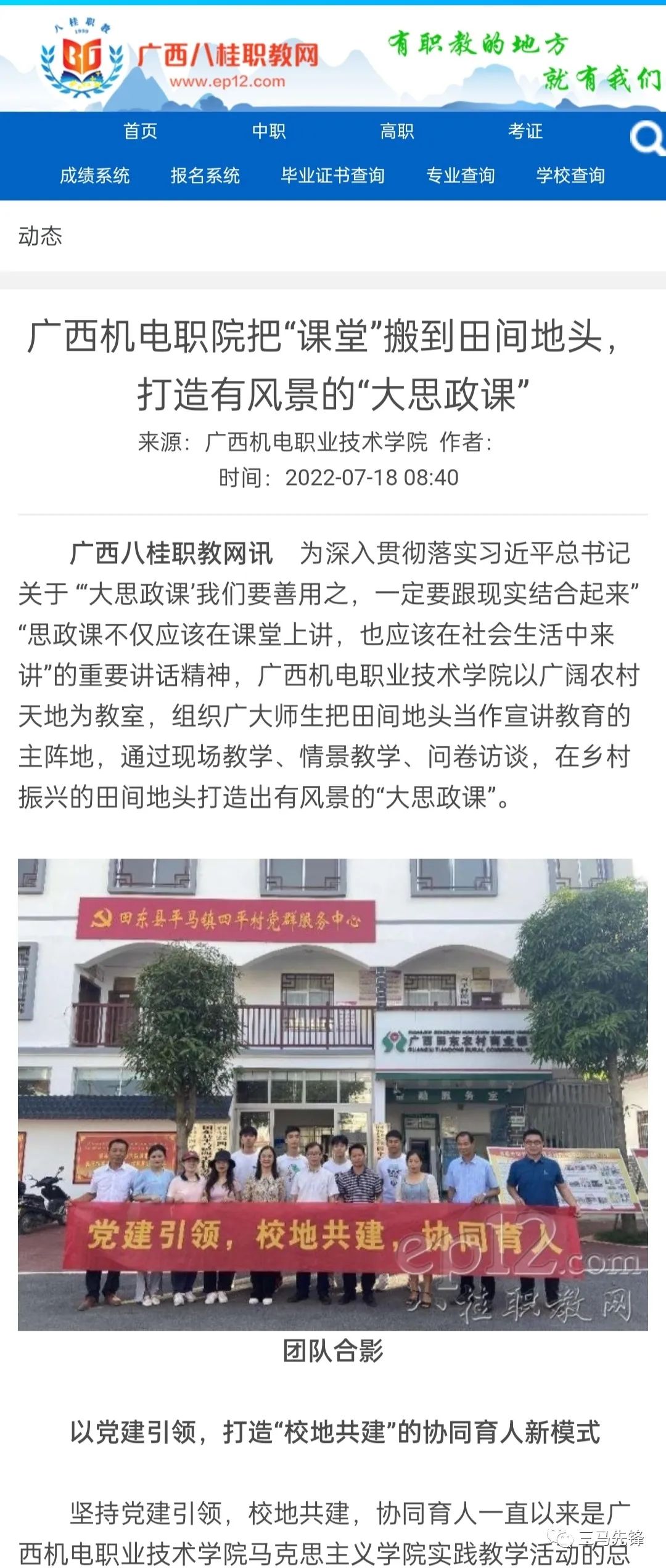 为贯彻落实习近平总书记关于“思政课不仅应该在课堂上讲,也应该在社会生活中来讲”的重要讲话精神,马克思主义学院教师利用暑期组织学生赴上林县巷贤镇六联村、高贤村等地开展“生态振兴”主题实践体验调研活动,把思政课课堂搬到广阔天地的农村,打造“田间课堂助力生态振兴”的“大思政课”,讲好生态乡村故事、讲好生态时代故事。活动受到广西八桂职教网等媒体的关注与报道。