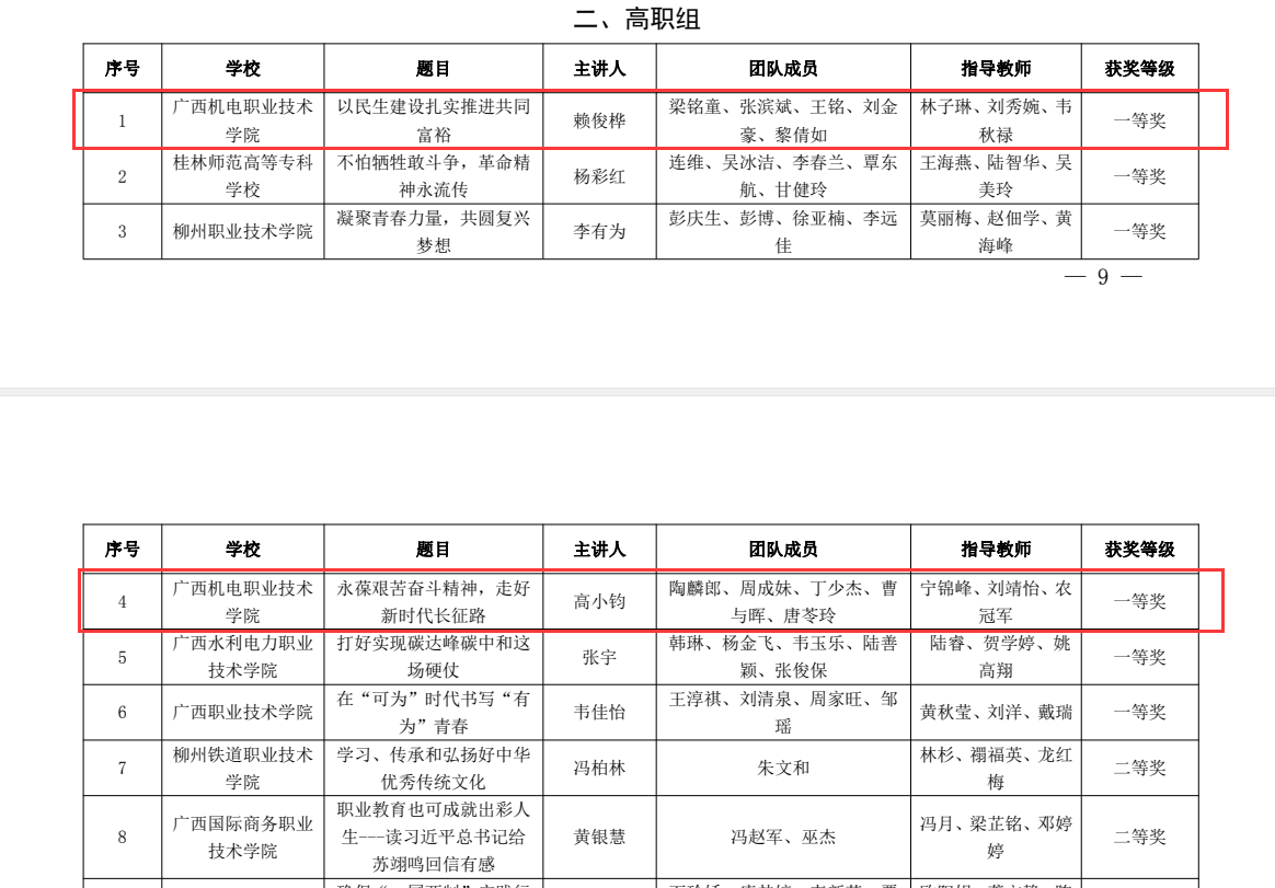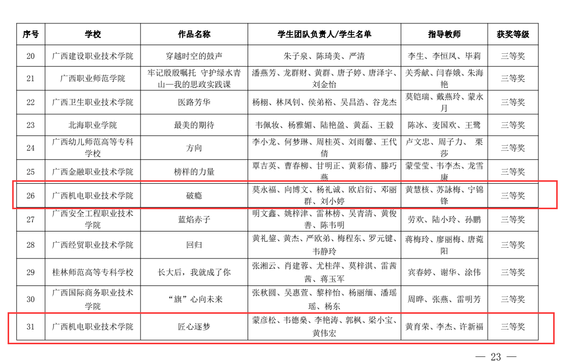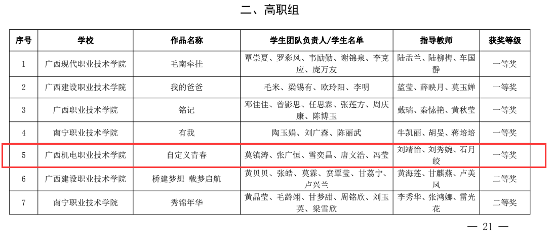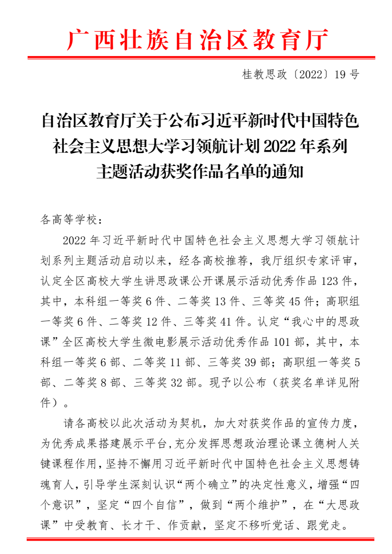 在“我心中的思政课”全区高校大学生微电影展示活动中,由刘靖怡、刘秀婉、石月皎指导的微电影《自定义青春》荣获一等奖,由黄慧核、苏詠梅、宁锦峰指导的微电影《破瘾》,和黄育荣、李杰、许福新指导的微电影《匠心逐梦》,两部作品荣获三等奖。