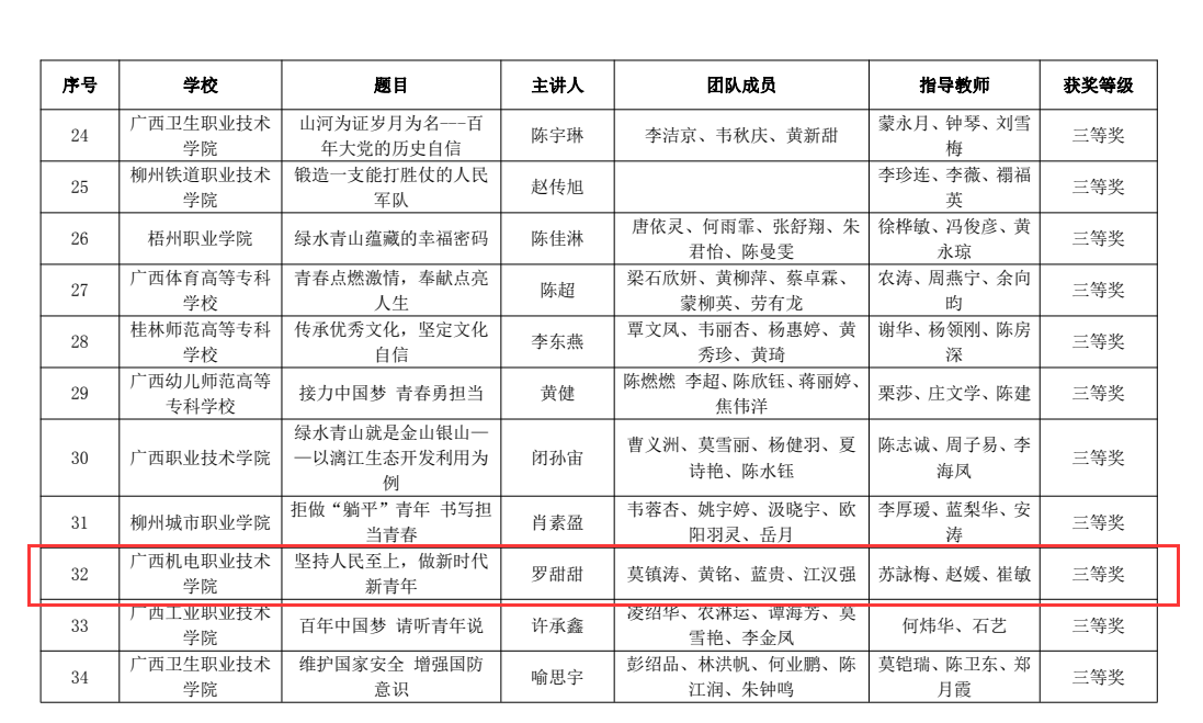 2022年全区高校习近平新时代中国特色社会主义思想大学习领航计划系列主题活动共包括2个赛项。在全区高校大学生讲思政课公开课展示活动中,由信息工程学院学生赖俊桦主讲,林子琳、刘秀婉、韦秋禄老师指导的作品《以民生建设扎实推进共同富裕》,以及由商学院学生高小钧主讲,宁锦峰、刘靖怡、农冠军老师指导的作品《永葆艰苦奋斗精神,走好新时代长征路》,均斩获一等奖;由电气工程学院学生罗甜甜主讲,苏詠梅、赵媛、崔敏老师指导的作品《坚持人民至上,做新时代新青年》荣获比赛三等奖。