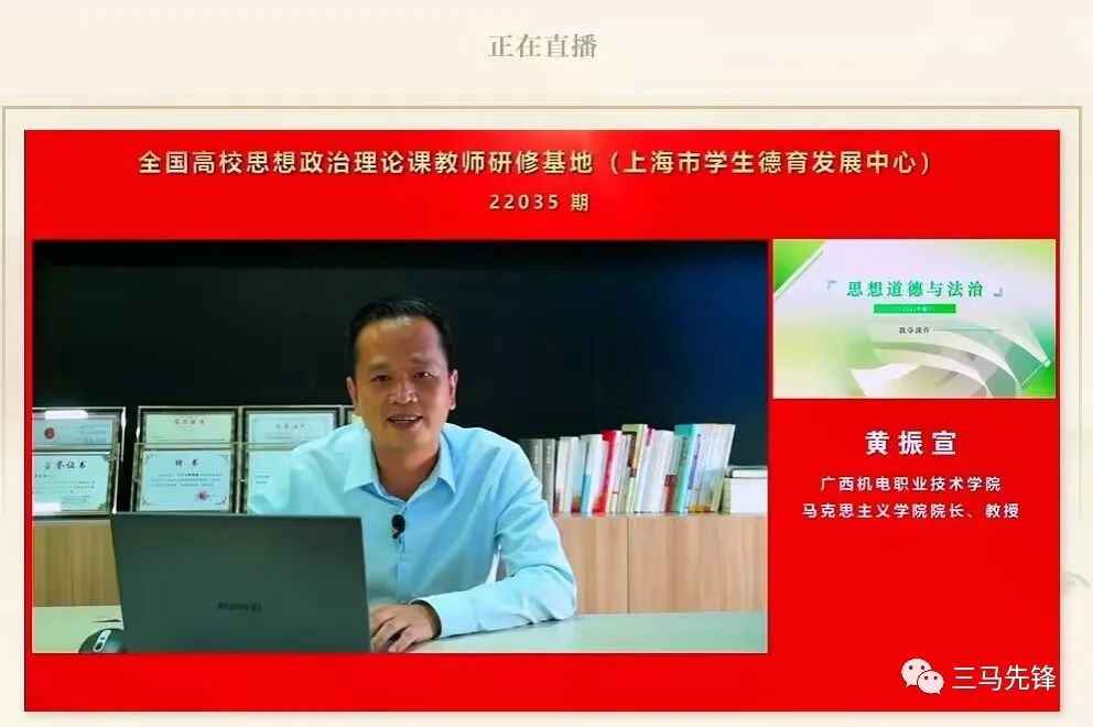 讲座中,黄振宣提到高职思政课应凸显其类型性,发挥职业教育办好思政课的比较优势,立足高职人才培养目标,实现思政课的“精准滴灌”“精准育人”。之后,黄振宣结合专题六的内容,细致的分析和讲解了教学思路,并对如何融入高职高专的特点提出了教学建议。