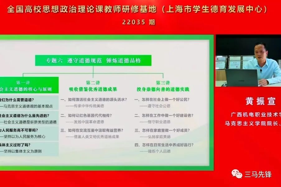近日,我院黄振宣教授受邀在中宣部、教育部组织的全国高校思想政治理论课教师研修班上,对《思想道德与法治》课程中的专题六“遵守道德规范 锤炼道德品格”作关于高职高专教学特点有机融入思路的专题讲座。