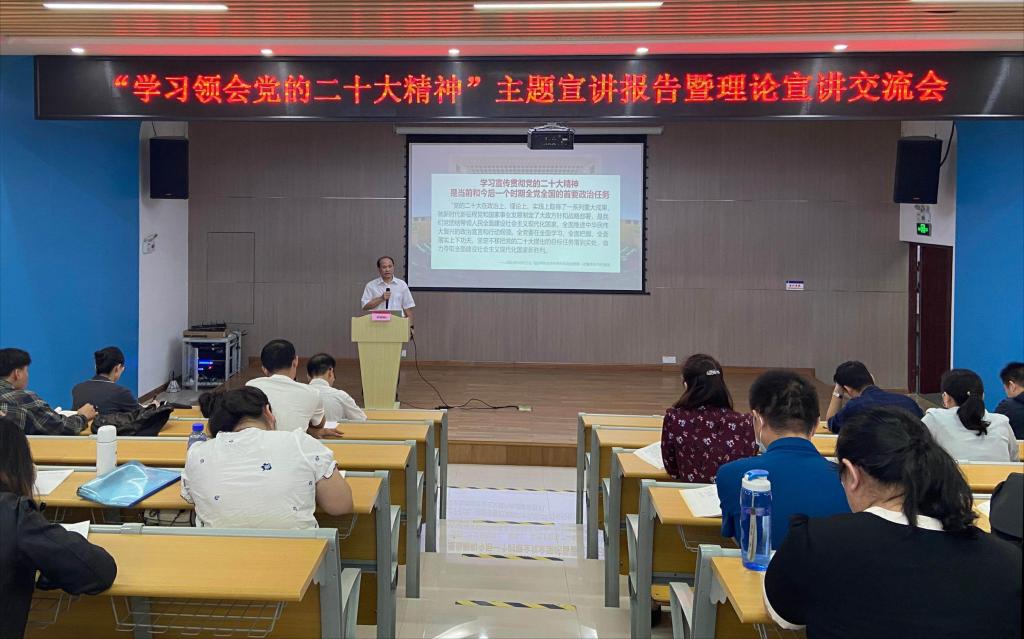 会上,陈科鹤副书记作了题为《统一思想 凝聚力量——学习领会党的二十大精神》的理论宣讲报告,从全面把握党的二十大主题和主要成果、深刻领会过去五年的工作和新时代十年的伟大变革、深刻领会开辟马克思主义中国化时代化新境界、深刻领会中国式现代化的中国特色和本质要求、深刻领会全面建设社会主义现代化国家的目标任务、深刻领会坚持党的全面领导和全面从严治党的重大部署、深刻把握我国经济社会发展面临的国内国际矛盾风险挑战等七个方面展开讲授,结合时政和事例细致解读了党的二十大报告,内容丰富,详实有据,帮助党员教师进一步学深学透大会精神。他强调,学习宣传贯彻党的二十大精神,是当前和今后一个时期全党全国的首要政治任务,我们要善于从大会报告中感悟思想伟力、汲取奋进动力,讲求学习实效和质量,用党的创新理论最新成果武装头脑、指导实践,自觉将精神力量转化到实际行动中,努力践行为党育人、为国育才的初心使命。