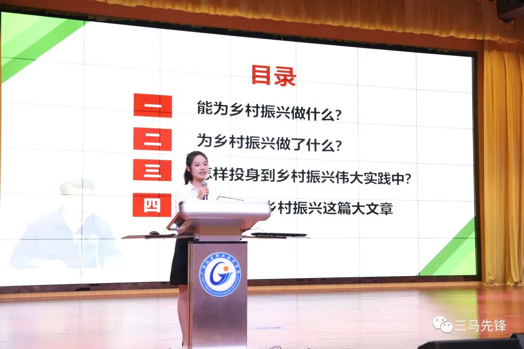 宣讲团成员陈楚文以《让青春能量在乡村振兴实践伟力中闪光》为题,结合党的二十大报告关于全面推进乡村振兴的部署要求以及习近平总书记对青年人的殷切嘱托,激励青年学生牢记使命担当,发挥专业技术技能优势,到新时代新天地中去施展抱负、建功立业,以实践行动投身于乡村振兴的伟大实践中。