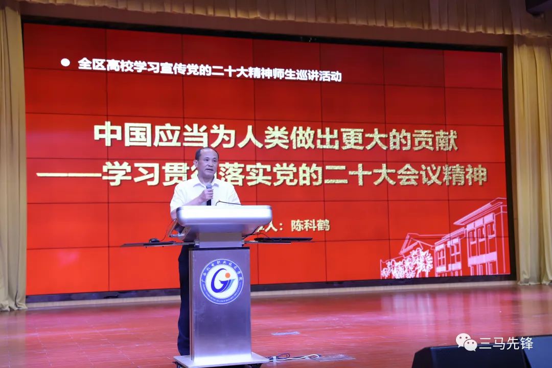 学校党委副书记陈科鹤以《中国应当为人类做出更大的贡献》为题,结合党的二十大报告有关为人类作出更大贡献的重要论述,深刻阐释中国共产党既是为中国人民谋幸福、为中华民族谋复兴的政党,也是为人类进步事业而奋斗的政党,中华民族伟大复兴号巨轮必将为人类进步事业作出更大贡献。