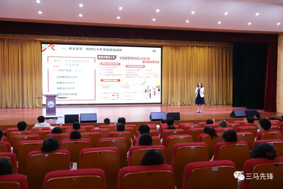 宣讲团成员陈鹤松以《推进文化自信自强 争做文化强国主力军》为题,深入阐述了党的二十大报告中对于推进文化自信自强,铸就社会主义新辉煌提出的具体部署要求,通过学校优秀校友陈芷晴和卓君等案例,激励学生增强文化自信,自觉践行社会主义核心价值观,提高自身道德水准和文明素质,推进中华优秀文化创新性发展,为文化强国建设贡献青春力量。