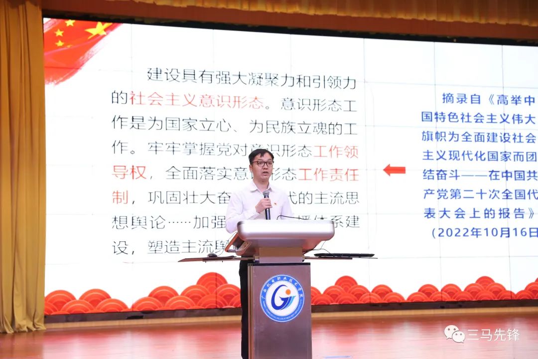 宣讲团成员林为湘以《以党的二十大精神筑牢高校网络意识形态安全防线》为题,结合党的二十大报告关于社会主义意识形态建设的要求,对高校为何要筑牢及如何筑牢网络意识安全防线,如何筑牢网络意识安全防线做了深入的阐释和解读。