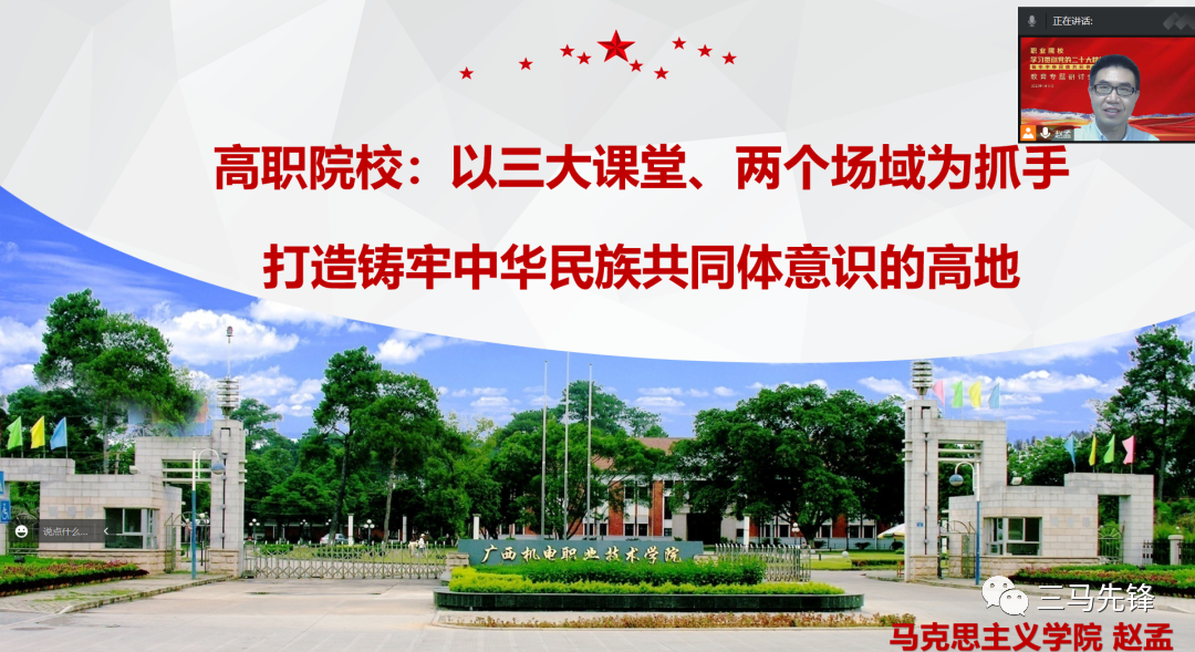 我院教师赵孟应邀参会并作了主旨发言。赵孟以《高职院校:以三大课堂、两个场域为抓手打造铸牢中华民族共同体意识的高地》为题,从民族地区高职院校铸牢中华民族共同体意识的现状、“三大课堂+两大场域”使中华民族共同体意识浸心入脑、强化“五个认同”共建中华民族共同体精神家园、配齐建强师资同心铸牢中华民族共同体意识等四个方面,交流分享了将党的二十大精神融入地方思政课教学的做法和经验,得到了与会专家学者的认可。