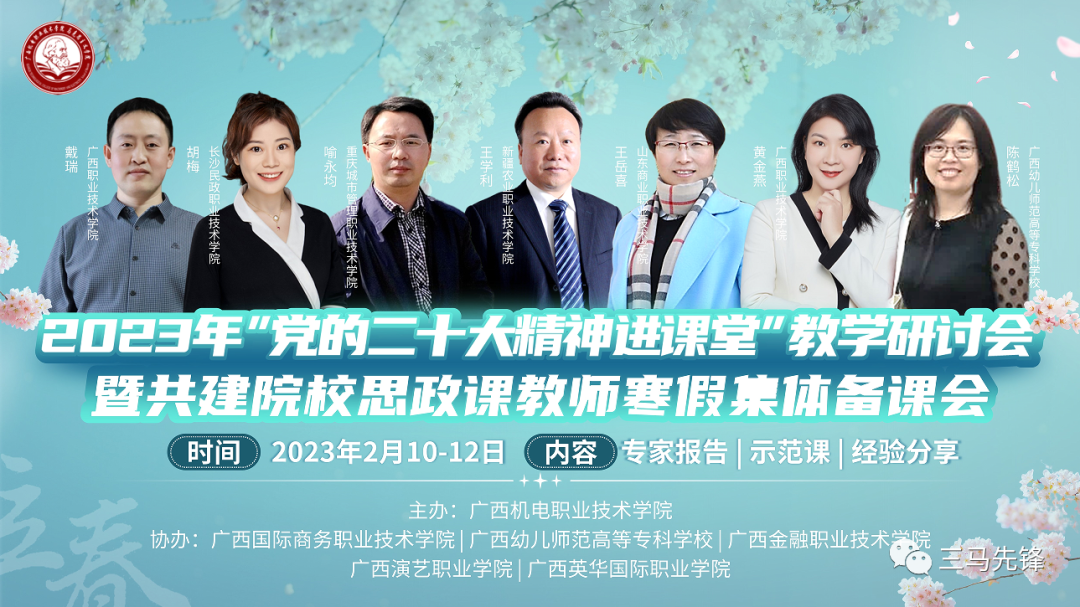 为深入学习宣传贯彻党的二十大精神,充分发挥集体备课会的示范辐射作用,凝心聚力推进党的二十大精神“三进”工作,2月10-12日,awc77万象城官网牵头联合广西国际商务职业技术学院、广西幼儿师范高等专科学校、广西金融职业技术学院、广西英华国际职业技术学院、广西演艺职业学院六所院校,共同举办2023年“党的二十大精神进课堂”教学研讨会暨共建院校思政课教师寒假集体备课会培训班。共建院校近200名思政课教师参加了集体备课会,会议采用线上线下相结合的方式进行。