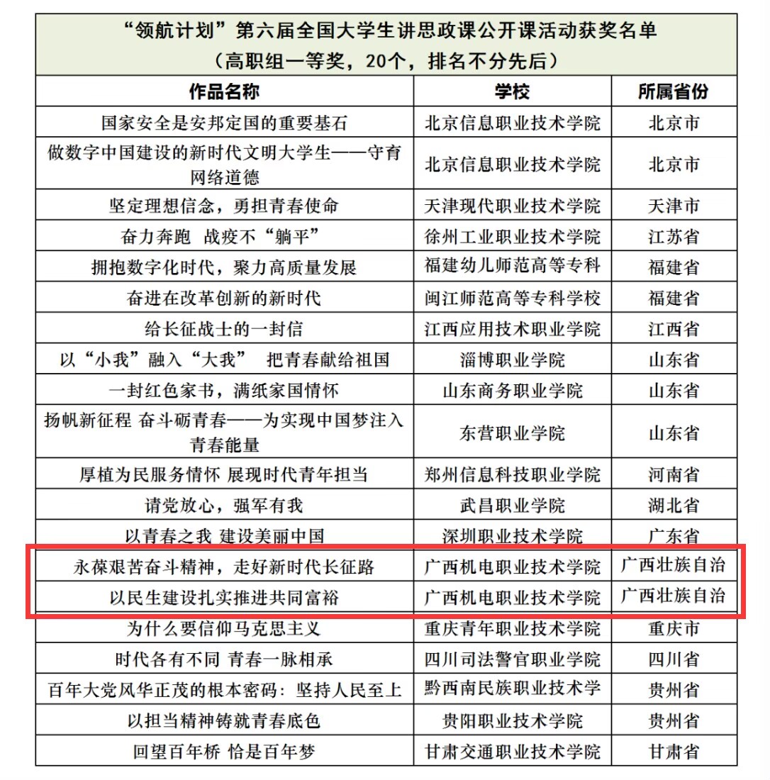 在第六届全国高校大学生讲思政课公开课展示活动中,由信息工程学院学生赖俊桦主讲,林子琳、刘秀婉、韦秋禄三位老师指导的作品《以民生建设扎实推进共同富裕》,以及由商学院学生高小钧主讲,宁锦峰、刘靖怡、农冠军三位老师指导的作品《永葆艰苦奋斗精神,走好新时代长征路》,两个作品均获全国一等奖。