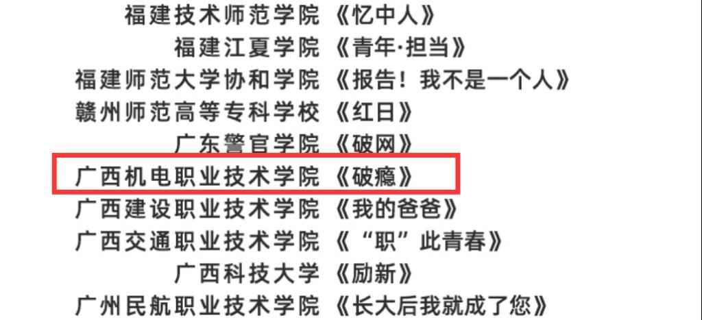 在第六届全国高校大学生微电影展示活动中,由学生向博文、杨礼诚、欧启衍、邓丽群、刘小婷等人主演,黄慧核、苏詠梅、刘靖怡、王杰、宁锦峰、赵媛六位老师指导的微电影《破瘾》获全国优秀奖。
