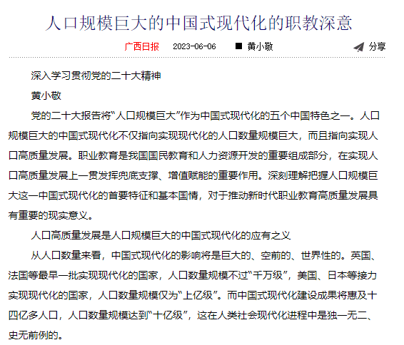 6月6日,广西日报理论版刊出万象城官网党委书记黄小敬理论文章《人口规模巨大的中国式现代化的职教深意》。文章从人口高质量发展是人口规模巨大的中国式现代化的应有之义、职业教育是人口高质量发展的强力支撑、提升社会认同是职业教育高质量发展的迫切需求三个维度论述中国式现代化与职业教育高质量发展的深刻联系。