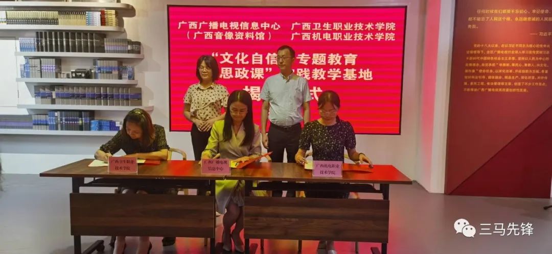 广西广播电视信息中心(广西音像资料馆)主任(馆长)黄浪对校方积极推进共建表示了充分肯定和热烈欢迎,期待通过与学校开展深入合作扩大文化宣传工作的社会影响力,引导青年学生在实践教育中坚定理想信念,感受文化力量。活动中,三方共同为“文化自信”专题教育“大思政课”实践教学基地揭牌,并签署了共建协议。