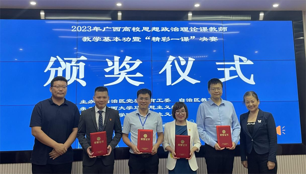 2023年10月14日,广西高校思政课教师教学基本功暨“精彩一课”比赛决赛圆满落幕。此次比赛分为初赛和决赛两个阶段,全区高校本专科院校在内共计两百多位思政课教师参加此次比赛,其中30名教师进入现场决赛。比赛最终评出特等奖10项(高职高专组4项、本科组6项),一等奖20项。