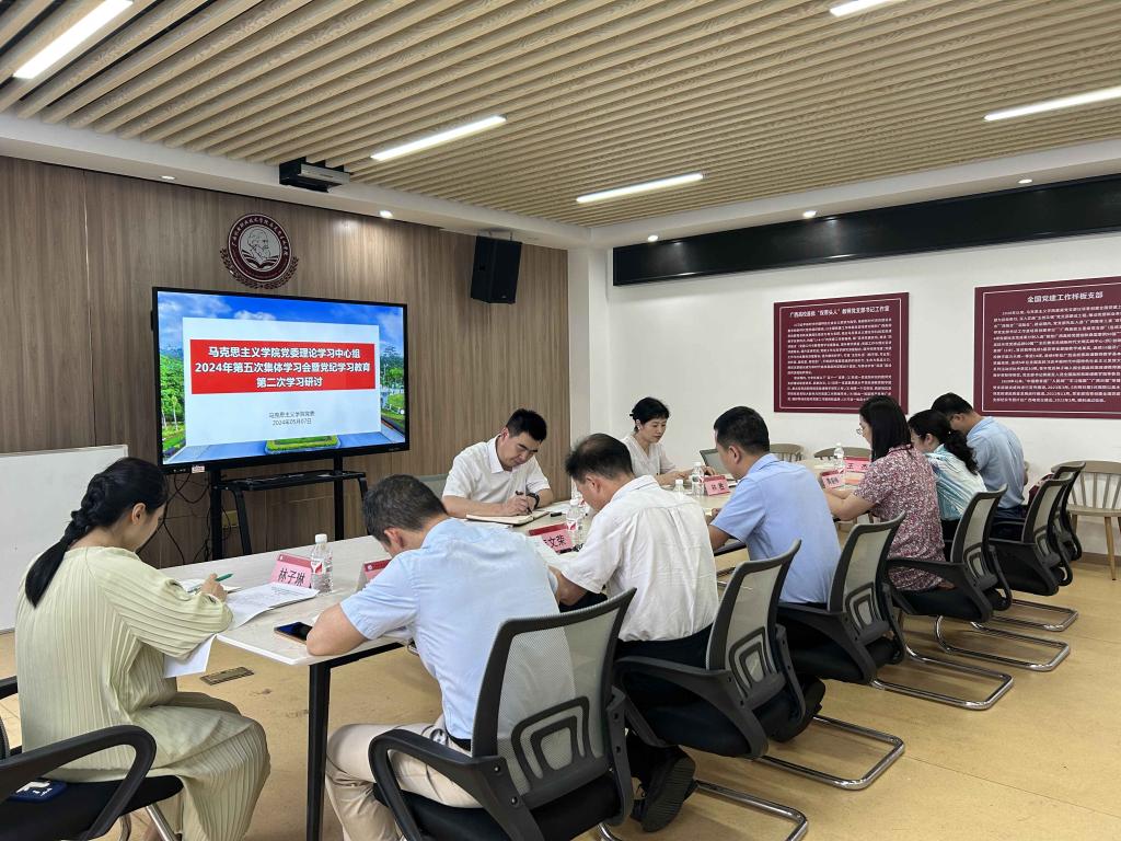 5月7日下午,马克思主义学院党委理论学习中心组开展2024年第五次集体学习(扩大)会暨党纪学习教育读书班集体学习,深入学习《中国共产党纪律处分条例》第二编第六章、第七章和《习近平关于严明党的纪律和规矩论述摘编》之“一、加强纪律建设是全面从严治党的治本之策”,围绕“政治纪律”“组织纪律”进行学习研讨。学校党委书记黄小敬、组织部部长林胜旁听会议。