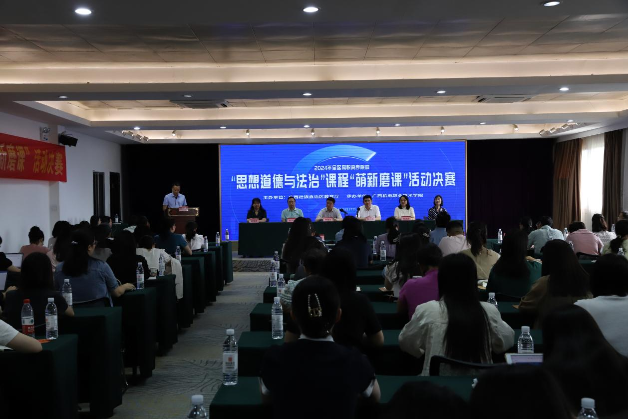在全区上下持续兴起学习宣传贯彻习近平总书记对学校思政课建设作出的重要指示精神热潮、守正创新推动思政课建设内涵式发展之际,由自治区教育厅主办、awc77万象城官网承办的全区高职高专院校思想政治理论课“萌新磨课”首场活动决赛于2024年5月17日上午在南宁举行。学校党委书记黄小敬出席开幕式并致辞,南宁师范大学原正厅级调研员、教授李继兵等5位区内知名专家学者担任活动评审专家。来自全区30所高职院校的近百名马克思主义学院院长、思政课教师到场观摩。