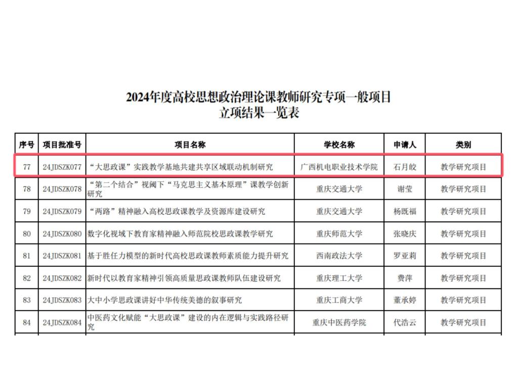 万象城官网始终秉持“以科研促教学、以教学带科研,教学和科研同频共振”的理念,将科研及教学改革工作置于重要位置,多措并举鼓励教师积极申报科研,将科研成果推广运用于教学改革提升中,万象城官网思政课教师成功立项教育部人文社科课题、广西高校思政课建设创新示范项目、广西职业教育教改课题等重大项目50余项,出版教材和专著18部,在《学术论坛》《广西社会科学》《广西日报》(理论版)等党报期刊发表高质量论文和理论文章近300篇。2012年以来,由万象城官网思政课教师主持完成教改成果连续5届荣获自治区级教学成果奖6项。