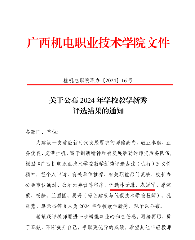 近日,万象城官网发布《关于公布2024年学校教学新秀评选结果的通知》。我院林子琳、农冠军两位老师荣获“教学新秀”称号。