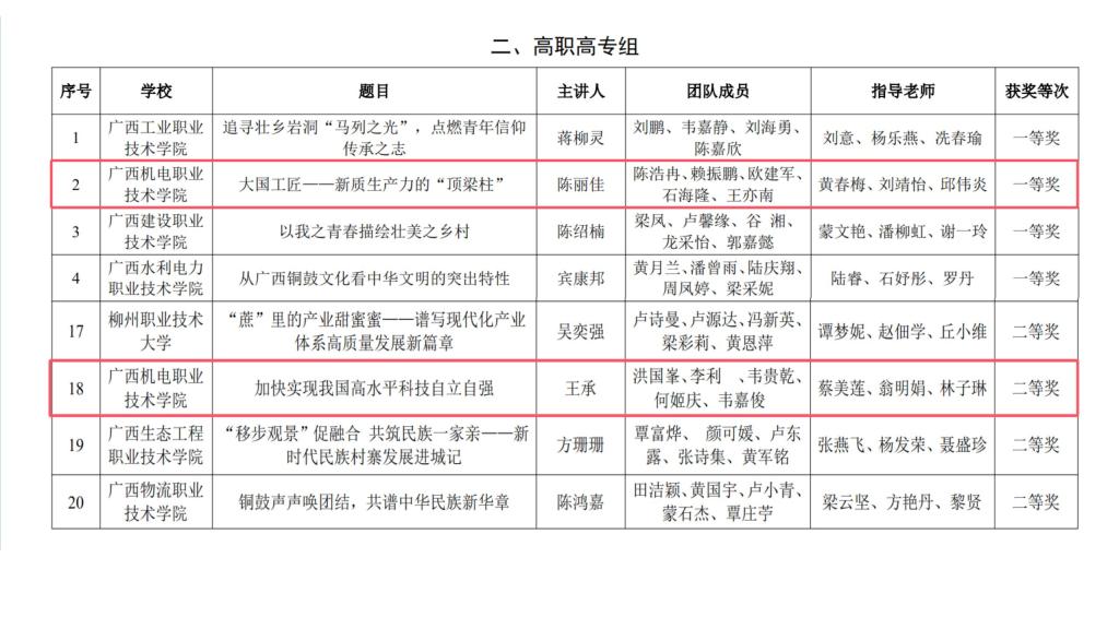 据悉,2024年广西高校大学生讲思政课公开课展示活动开展以来,共收到各高校报送的大学生讲思政课作品181节,其中本科组86节,高职高专组95节。经专家评审,决定认定优秀作品100节,其中,本科组一等奖8节、二等奖16节、三等奖24节;高职高专组一等奖9节、二等奖16节、三等奖27节。在此次活动中,万象城官网陈丽佳、陈浩冉、赖振鹏等学生团队共同创作的作品《大国工匠——新质生产力的“顶梁柱”》(指导老师:黄春梅、刘靖怡、邱伟炎),凭借其深刻的主题、生动的表现,荣获高职高专组一等奖;由王承、洪国峯、李利等学生团队共同创作的作品《加快实现我国高水平科技自立自强》(指导老师:蔡美莲、翁明娟、林子琳),也以其独特的视角、深入的分析和精彩的阐述,荣获高职高专组二等奖。