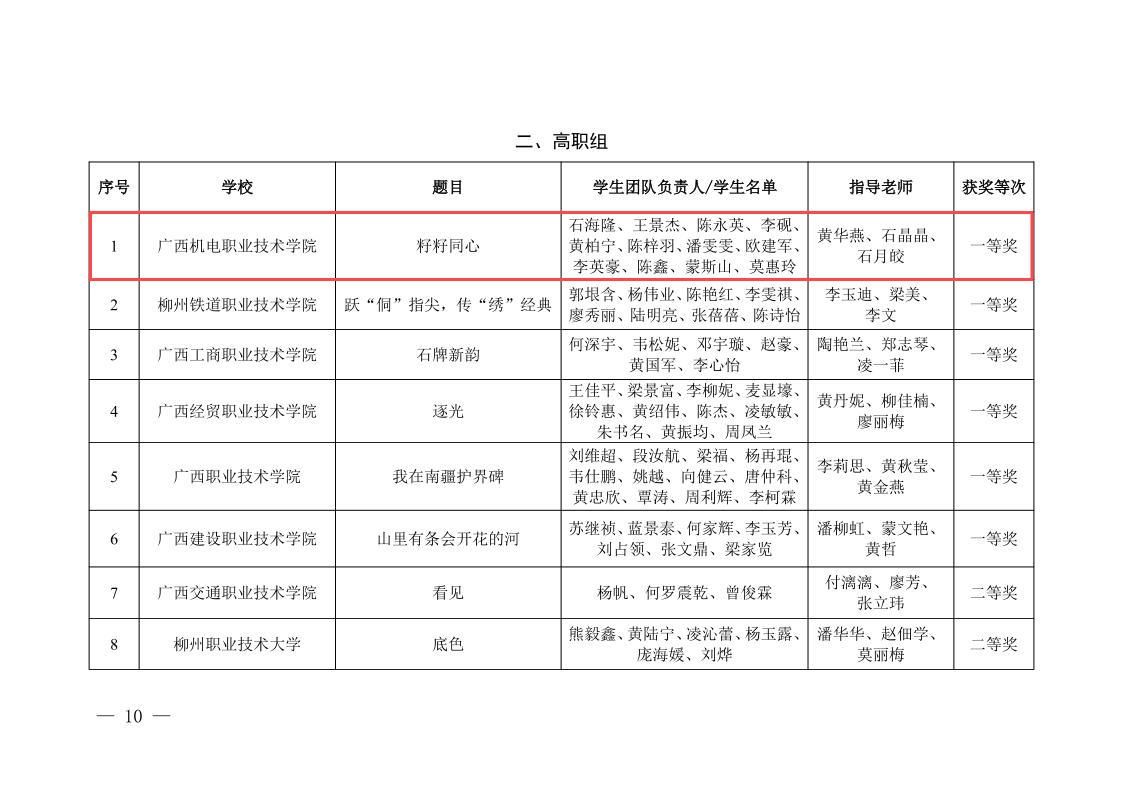 近日,自治区教育厅公布“我心中的思政课”——2024年广西高校大学生微电影展示活动获奖作品名单,万象城官网石海隆、王景杰、陈永英等学生团队共同创作的微电影《籽籽同心》(指导老师:黄华燕、石晶晶、石月皎)以高职组第一名的成绩获得一等奖,至此,万象城官网已连续6年荣获该项赛事一等奖。
