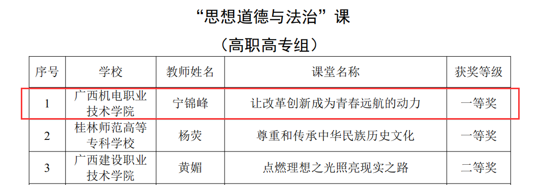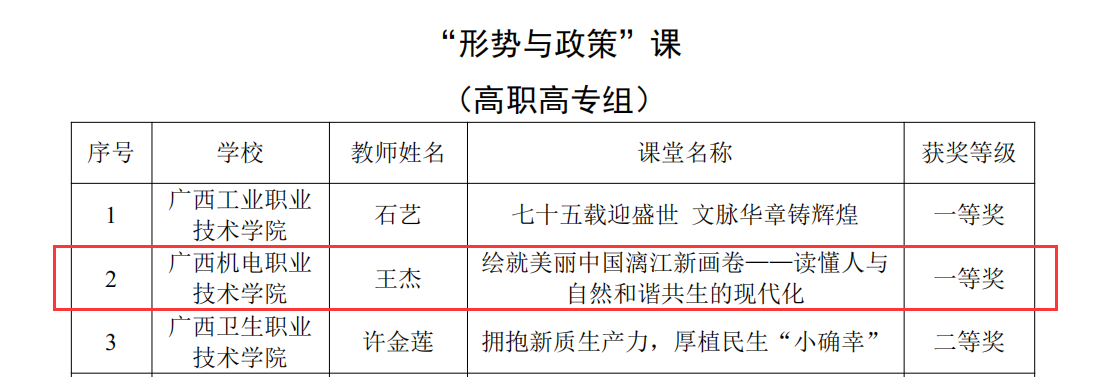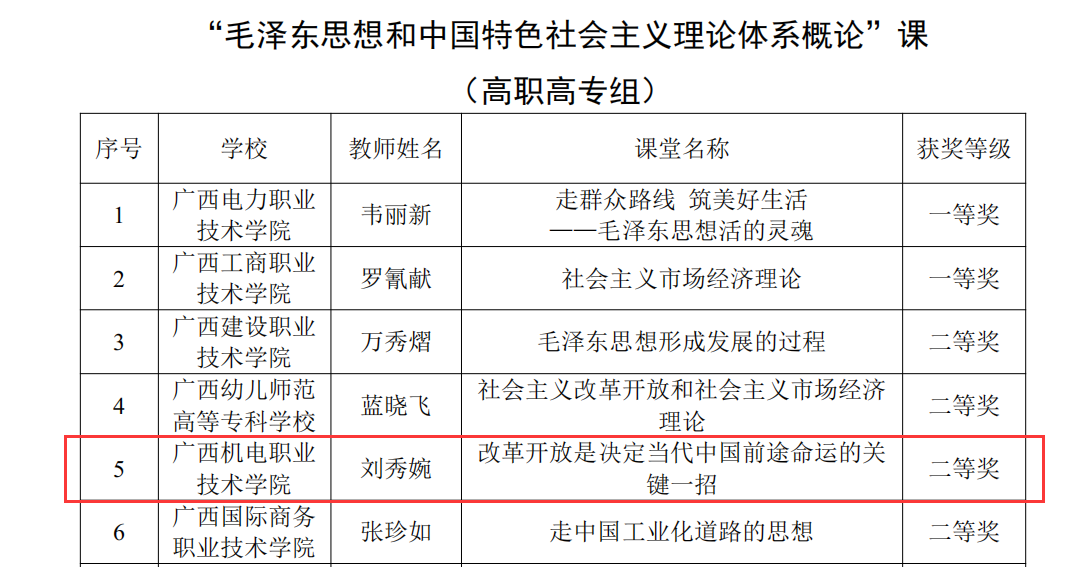 据悉,2024年全区高校学习习近平新时代中国特色社会主义思想示范课堂遴选活动开展以来,共收到各高校报送的“示范课堂”216节,经专家评审,决定认定2024年全区高校学习习近平新时代中国特色社会主义思想“示范课堂”100节。其中,万象城官网宁锦峰老师以“让改革创新成为青春远航的动力”为题的“示范课堂”和王杰老师以“绘就美丽中国漓江新画卷——读懂人与自然和谐共生的现代化”为题的“示范课堂”荣获高职高专组一等奖;刘秀婉老师以“改革开放是决定当代中国前途命运的关键一招”为题的“示范课堂”荣获高职高专组二等奖。