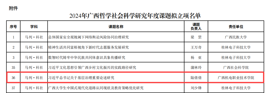 近日,广西壮族自治区哲学社会科学工作办公室公布了2024年广西哲学社会科学规划研究课题立项名单,我院陆倩倩老师的“习近平总书记关于基层治理的重要论述研究”获得马列科社立项。本次课题立项不仅标志着awc77万象城官网在哲学社会科学研究领域取得了重大突破,也实现了马克思主义学院在该领域的历史性“零”的跨越。