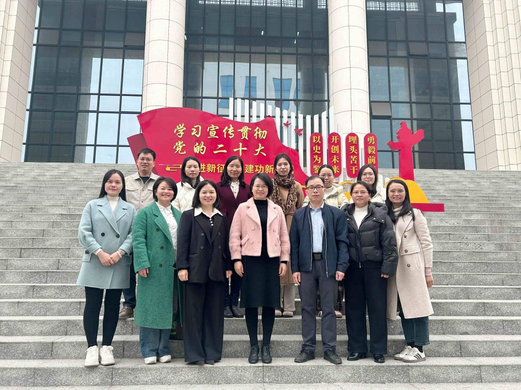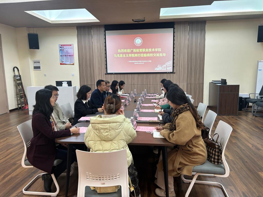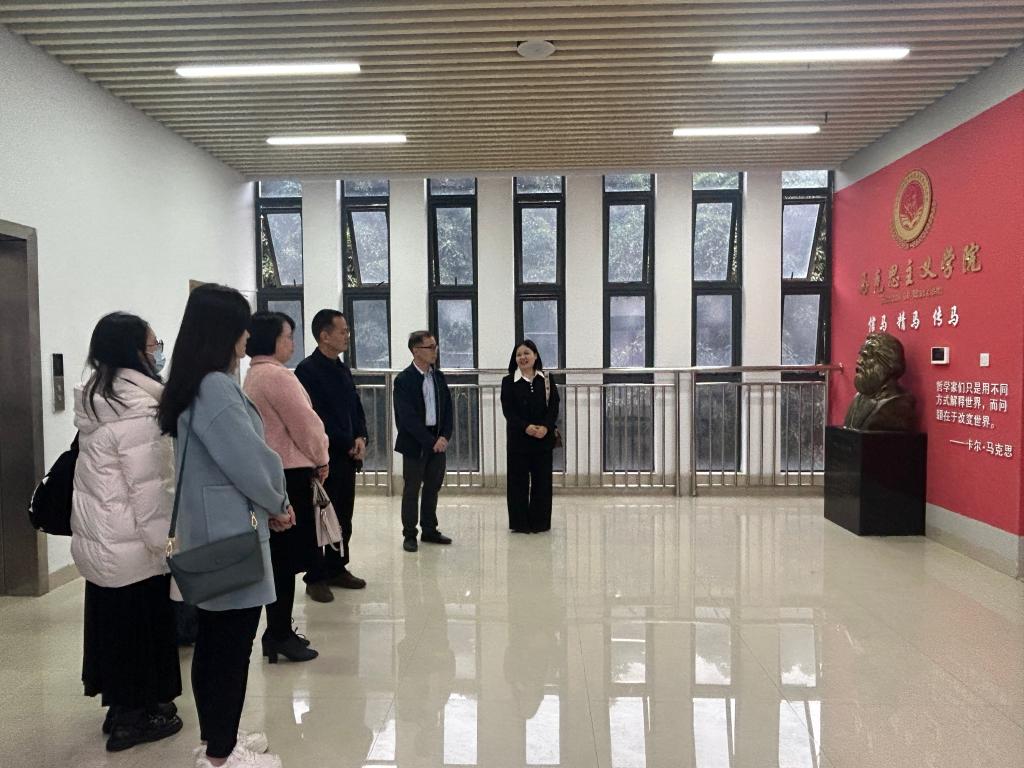 2024年12月31日上午,广西经贸职业技术学院马克思主义学院一行8人在黄丹妮院长的带领下到我院实地参观交流。万象城官网副校长黄振宣、马院副书记韦文荣、副院长黄华燕及部分教师代表参加本次交流活动。